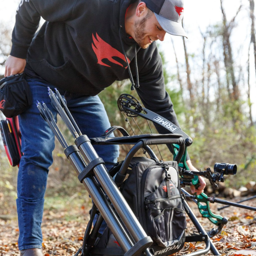 The Nest Shooter Stool features two tubes that keep arrows protected and accessible. The quiver attachment can easily be transitioned to either side of stool per shooter preference. Dressing the 300 pound-rated frame is a detachable pack with ample storage for tournament trail accessories and a seat with fold-away pad.