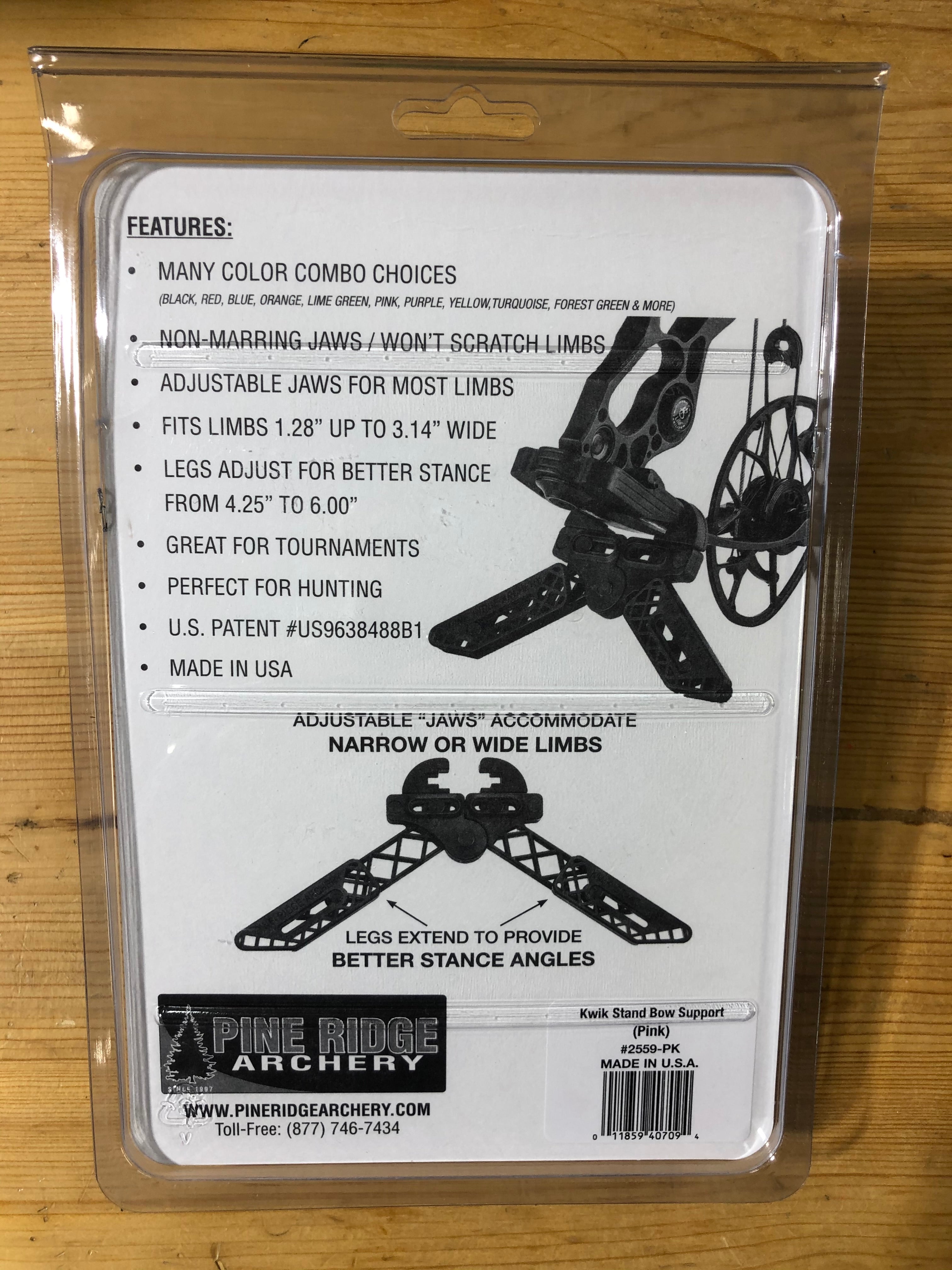 The Kwik Stand Bow Support solves all the issues archers have with current bow stands on the market. With very simple adjustments, the Kwik Stand will fit on most bow limbs, even the wide limbs like the Mathews Halon¨ that others will not. The legs adjust as well to allow for the best balance angle for your bow. Put these innovative features together with USA made quality and durability and you have the only bow stand you will need!