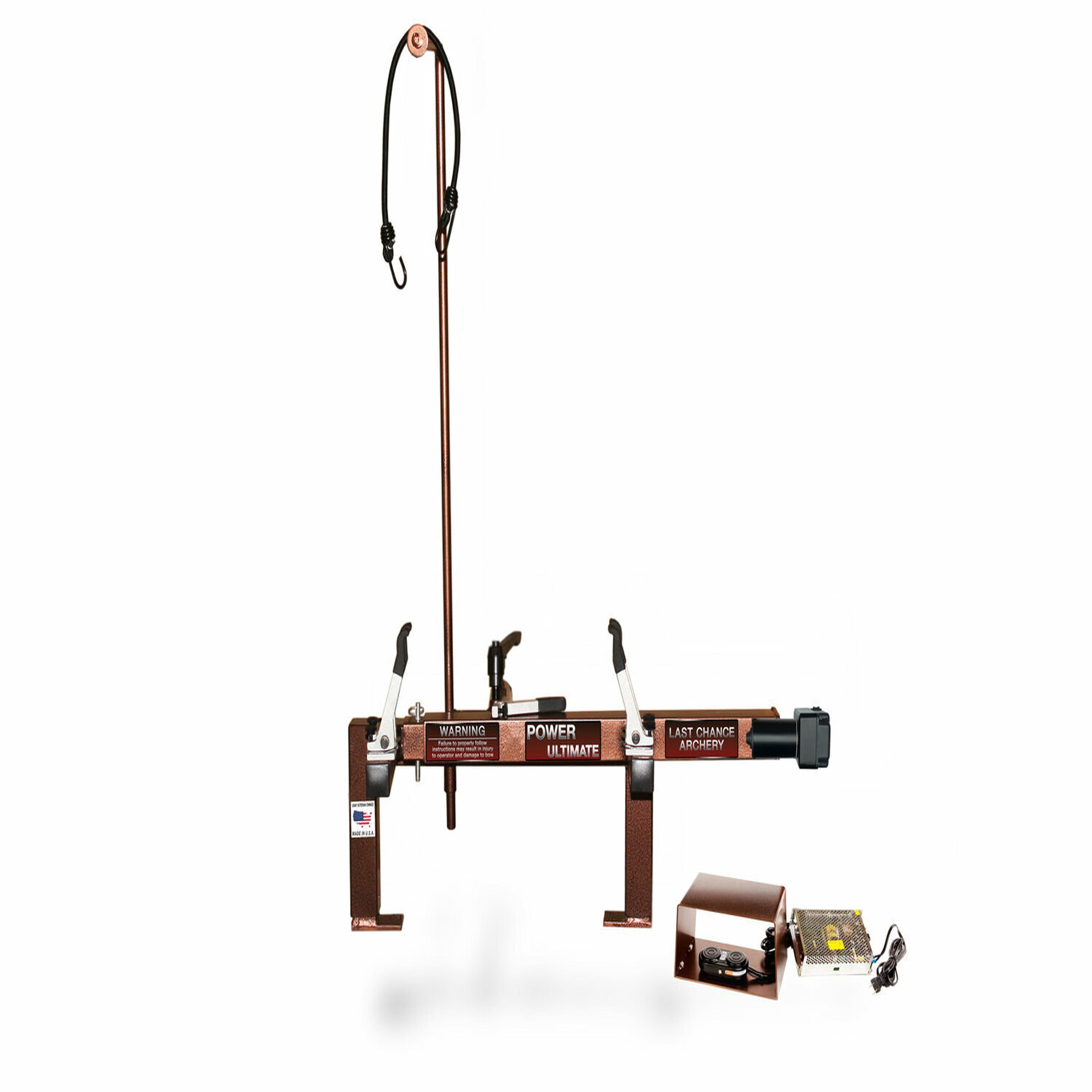 The Power Ultimate Deluxe is designed for quick and easy set-up of most compound bows and crossbows. This press is perfect for both home and shop use, and it's effortless to use. Each LCA press model is equipped with the LCA patented finger system that allows you to press your bow precisely as if it's being drawn back. While pressing your bow, you're not applying any extra pressure to your limbs, and you're also not applying torque to your riser. The Power Ultimate Deluxe moves in and out using a powered motor, with an included foot control switch for fast and smooth movement. With the addition of the foot control switch, you can keep both hands on the bow at all times. This particular press model has a range that spans from 11" - 54" axle to axle length. One other great feature about LCA Deluxe model presses is that they can pivot from vertical to horizontal. Ultimate units use a much thicker grade material so that the press itself is strong enough to handle high poundage crossbows.